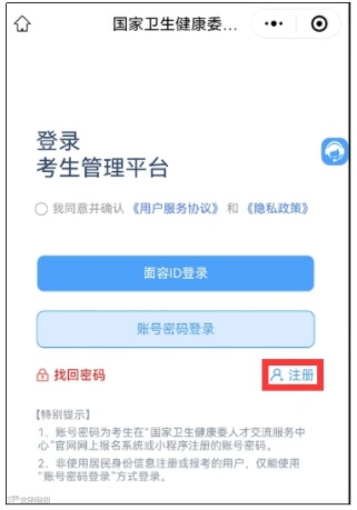 1.打开百度、微信客户端,搜索“国家卫生健康委人才交流服务中心”小程序,进入考生管理平台登录界面,点击“注册”。