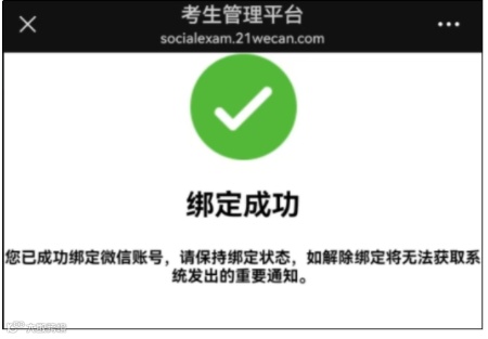 绑定成功后微信会反馈“绑定成功”提示,考生即完成注册和基本信息填报。