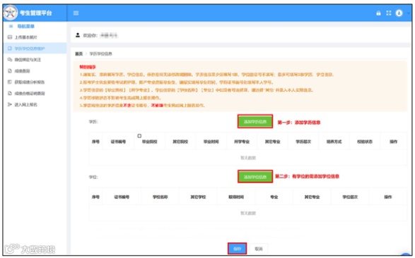 请仔细阅读特别提示内容,按要求添加学历或学位信息,添加完成后点击【保存】按钮,完成学历或学位信息的维护,最多可维护5条。