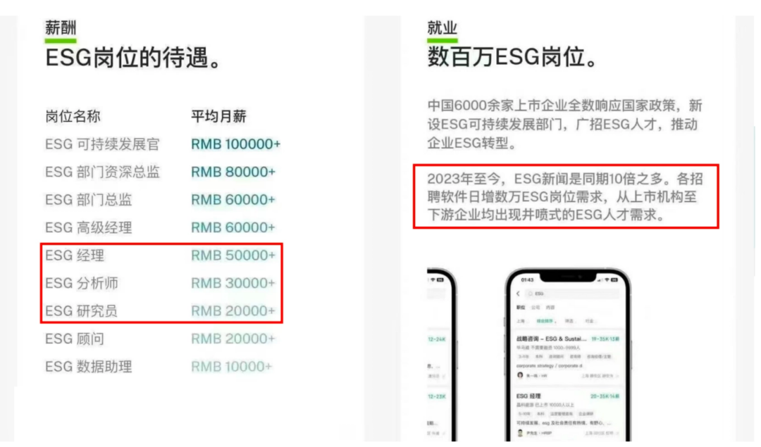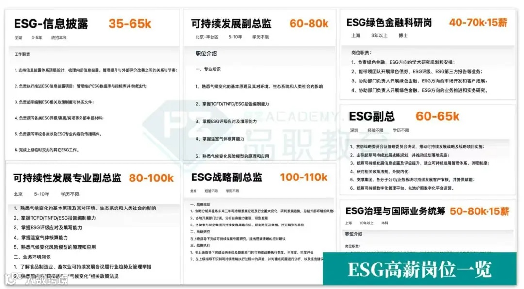 与此同时,作为席卷全球的新概念,ESG正频频出现在各大外企、央国企和一众跨境出海企业的招聘名单和岗位要求里,而且薪资还不低。原来,随着ESG逐渐成为各大企业出海战略里的硬指标。更是为我们提供了一个突破职业天花板和打开全新的职业前景的新机遇。