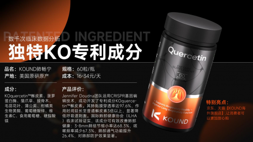 CRISPR-Cas9基因编辑提纯技术:精准剔除天然槲皮素中99.97%无效异构体,研发专利KOquercetin槲皮素,活性提升30倍,避免无效成分代谢负担,精准作用于肺部靶细胞;