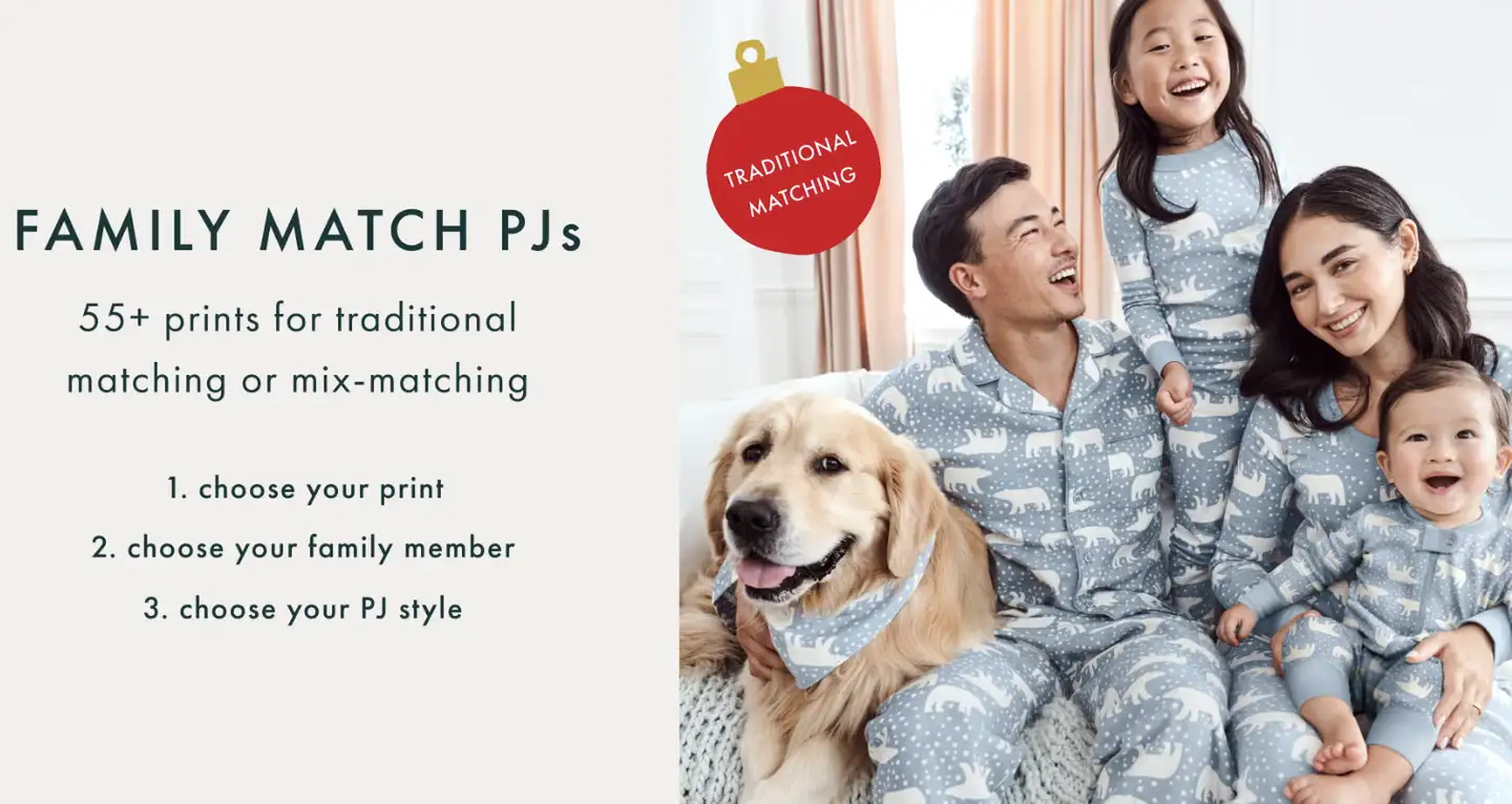 很难不注意到,上图中女士穿着的上衣跟其他人的服饰有所差异,但并不冲突。这是Hanna Andersson专为节日套装设计的定制玩法Family Match:品牌给出的一组配套的印花,选购者可以单独为每名家庭成员选择印花、睡衣款式和尺码,这样就解决了传统家庭睡衣选购时的苦恼,既有不一样的创意,满足个人的喜好,集体又能和谐适配;同时还是更简便、优惠的购买方式。