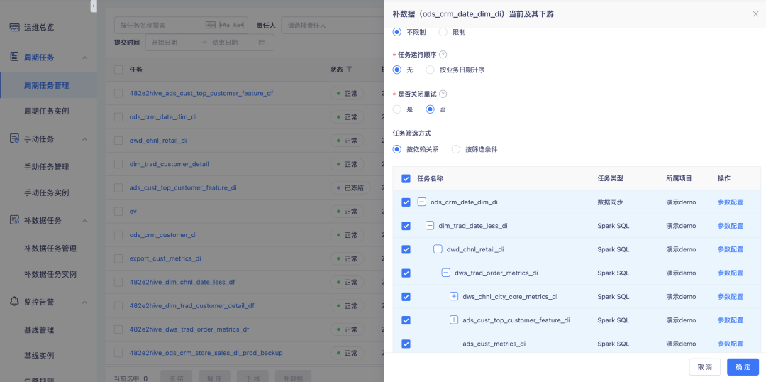 按依赖关系补数据:当某一任务的上游数据发生变更(如源头表数据修正),其下游所有依赖该任务的任务也需同步重刷时,平台会根据任务间血缘关系自动识别当前任务的所有下游任务并以列表展示,一次性覆盖 “当前任务 + 所有下游任务”,确保全链路数据一致性。