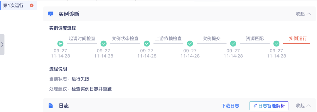 任务诊断功能:对于补数据实例,系统会按实例所涉及流程进行诊断,提示异常原因,给出建议方案。