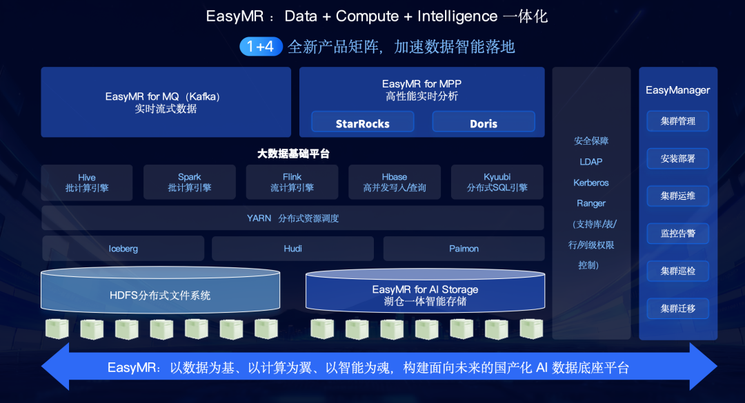 EasyMR是袋鼠云构建的面向未来的国产化AI数据底座平台 ,其核心是“1+4”全新产品矩阵 ,旨在解决最基础的存算、运维和国产化适配问题。