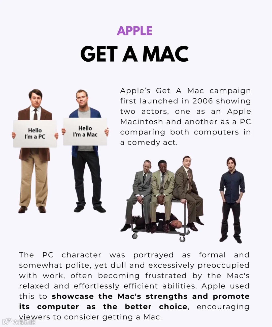 苹果的"Get a Mac"广告系列以幽默风趣的方式对比了Mac电脑与其他电脑的优势。从专业角度来看,苹果成功地运用了差异化战略,通过突出产品的独特性和创新性,为品牌赢得了国际市场的关注。这种独特的定位战略成为许多行业效仿的典范。
