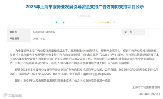 为全面提升上海广告业整体质量和能级水平,激发市场主体创新活力,提升产业竞争力,促进广告产业规模持续增长,根据《上海市服务业发展引导资金支持广告方向实施细则》(沪市监规范〔2025〕4号)精神,市市场监管局组织开展了本市2025年服务业发展引导资金支持广告方向项目的申报及评审工作。