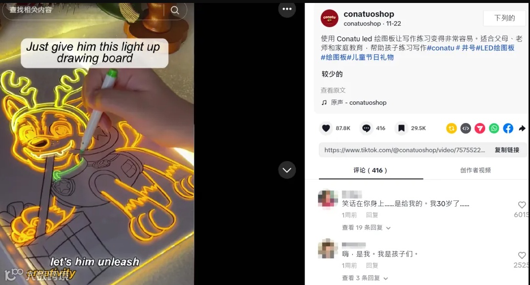 得益于独特的选品思维,这位名为“Conatu”的跨境卖家靠着一款LED绘图板成功切入“治愈系经济”、以及在TikTok美区溢价10倍后率先在圣诞节前夕实现了爆单,目前在短短一周时间已经成功斩获了超500万元人民币营收。