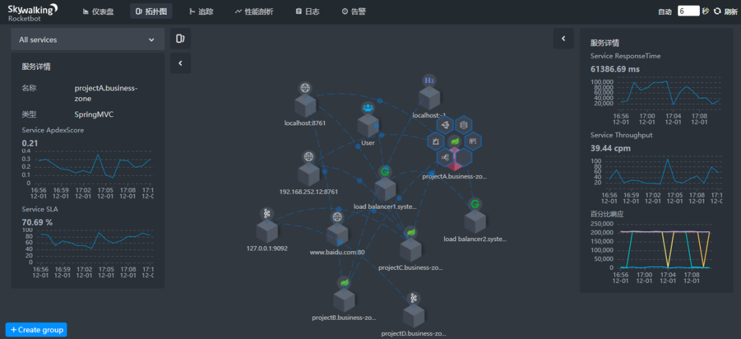 SkyWalking允许用户了解服务和端点之间的拓扑关系,查看每个服务/服务实例/端点的度量,并设置警报规则。