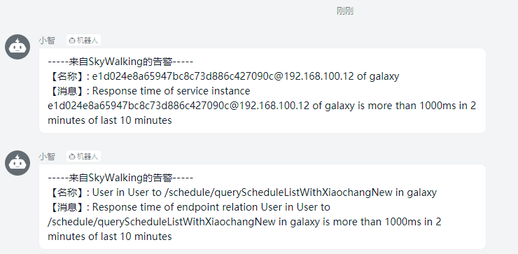 alarmMessageDTOList.forEach(e->dingTalkAlarmService.sendMessage(MessageFormat.format("-----来自SkyWalking的告警-----\n【名称】: {0}\n【消息】: {1}\n", e.getName(), e.getAlarmMessage())));