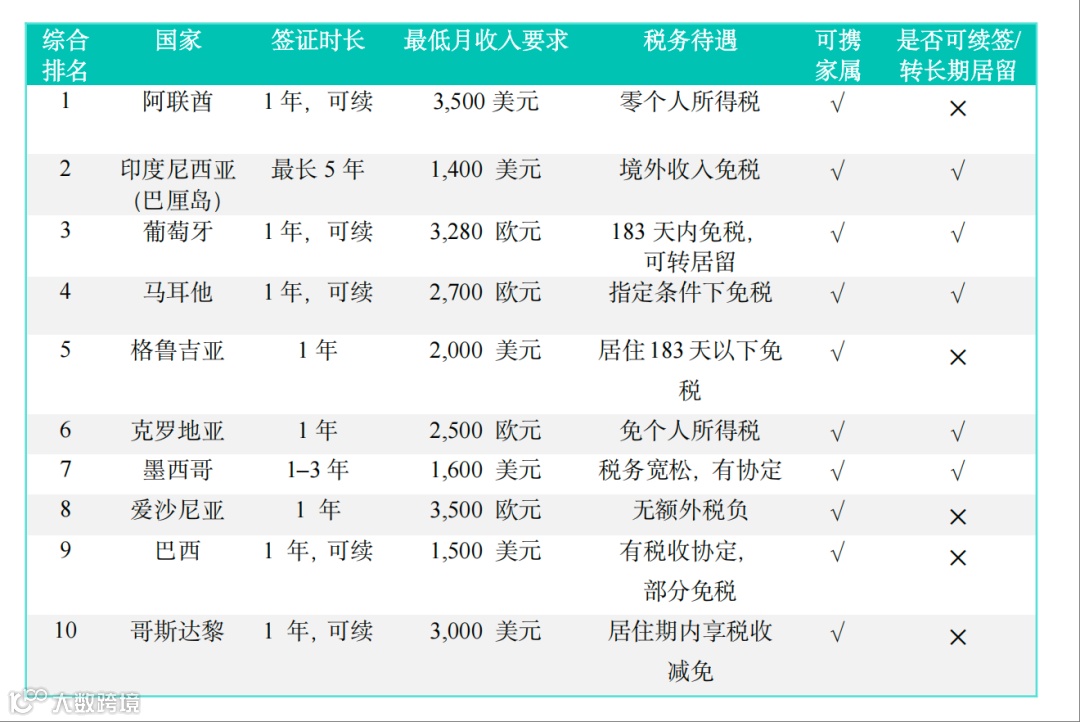 · 巴西:提供一年期远程签证,可续签,月收入要求 1,500 美元,拥有双重征税协定,税务风险较低。