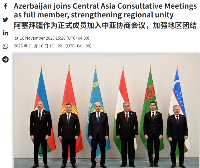 阿塞拜疆以正式成员身份加入“中亚国家元首协商会议”,标志着该合作机制从中亚五国(C5)扩展为中亚六国(C6),对区域合作与地缘格局有多重影响,是一次重大的转型。