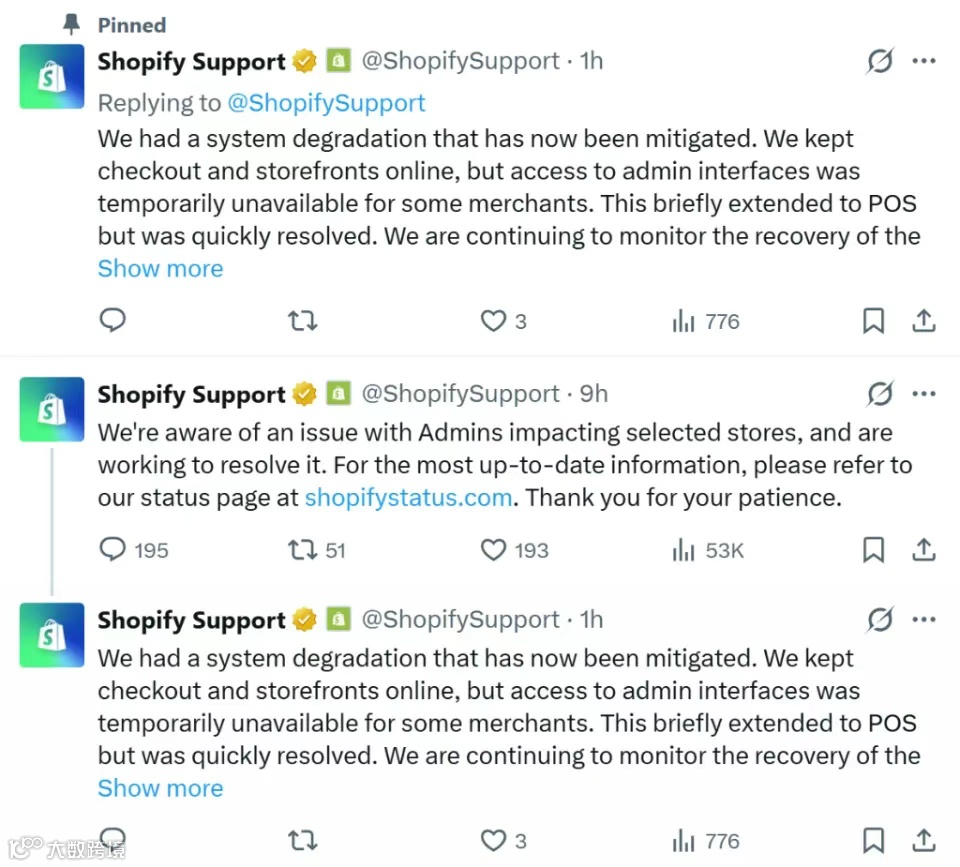 此次故障发生时间高度敏感——正值北美消费者线上购物流量峰值时段[3]。Downdetector监测显示,美东时间11点故障报告达近4000例峰值;直至下午3点30分,Shopify才在官方状态页宣布“登录验证问题已修复”,部分商户后台卡顿持续至当晚[4]。整场中断历时约6小时,几乎覆盖当日最关键销售窗口[5]。