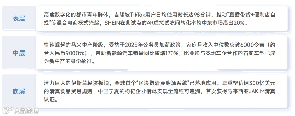 市场呈现三层结构:都市青年推动“直播带货+便利店自提”;马来中产带动新能源车消费跃升;伊斯兰经济板块重塑300亿美元清真食品贸易规则[16]。