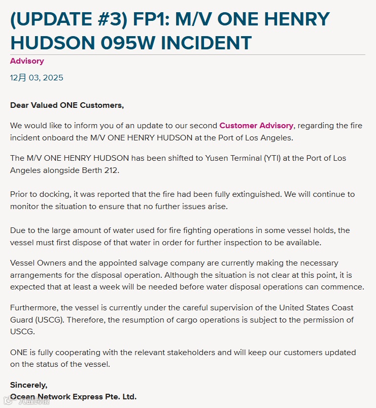 日前,ONE官网更新了“ONE HENRY HUDSON”轮火灾事件进展。该船在返回洛杉矶港停泊一周后,仍处于等待启动消防废水清除工作的状态。