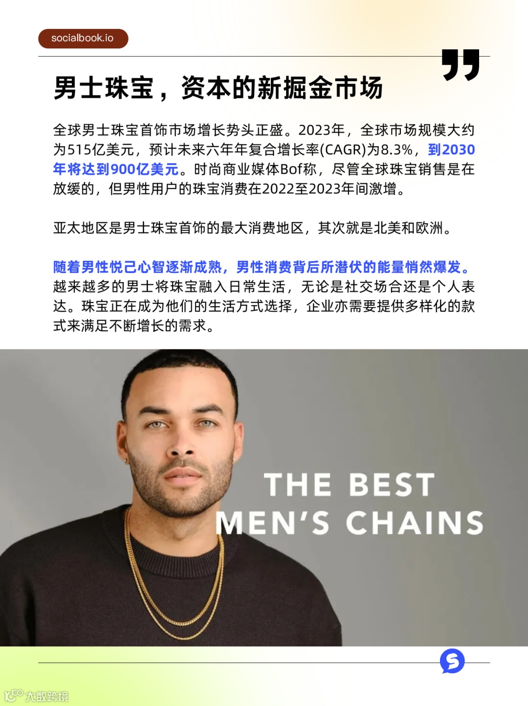 受性别流动文化趋势及社交媒体时尚偶像带动,全球男士珠宝消费持续升温。