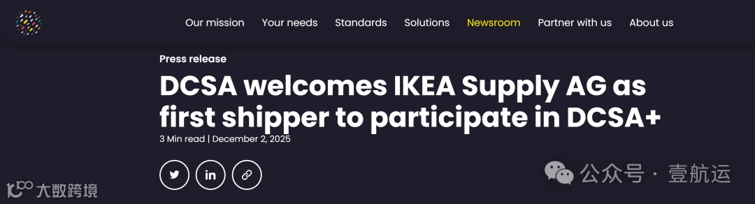 据壹航运最新获悉:12月2日,数字集装箱运输协会DCSA(Digital Container Shipping Association)宣布,全球知名货主企业宜家IKEA已正式加入其合作伙伴计划 DCSA+,成为首家加入该计划的全球知名货主企业。