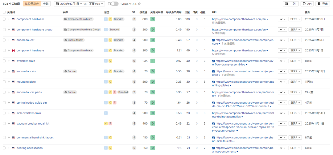 关键词:Component Hardware的SEO策略,是依托大量SKU形成“长尾词覆盖”。五金配件采购商通常不会搜索宽泛的大词,而是直接输入型号、材料、尺寸、功能等组合词。因此虽然这类词搜索量不大,但商业意图非常强,会更容易带来转化。