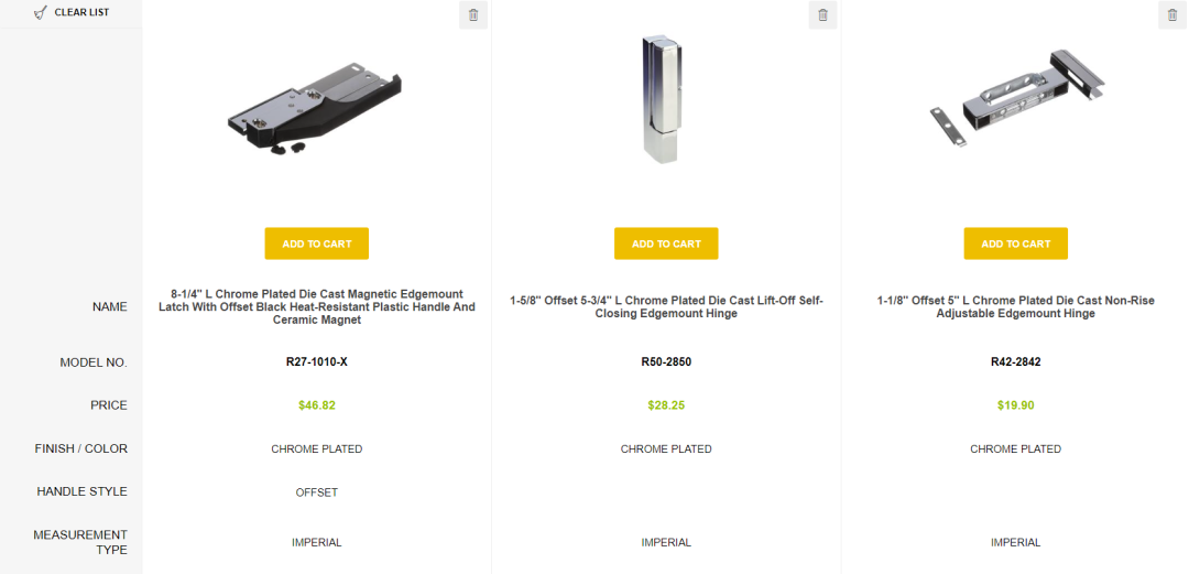 产品对比:在企业采购中,即使属于同一产品大类,型号、材质、结构、安装方式、价格等都会有细微差异,工程部门通常需要逐条对比才能完成选型。Component Hardware的产品对比工具,允许用户在页面中直接将多个产品加入对比列表,从规格、尺寸、材质到结构和价格都能一目了然。