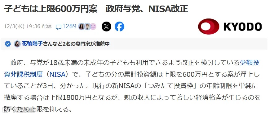 日本政府拟将NISA适用对象扩展至0岁起未成年人,设立终身免税投资上限600万日元。该上限低于成人NISA现行1800万日元限额,旨在防止富裕家庭在婴儿期即集中注资、加剧代际资产分化。