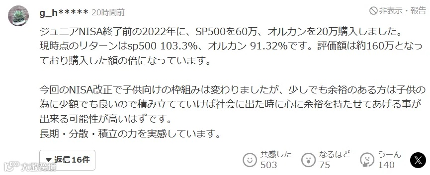 以小额定投(如每月3000–5000日元)起步,借助长期、分散、定投策略,有望在子女成年时形成可观教育或创业储备金。历史数据显示,2022年前参与青少年版NISA的投资者,若配置S&P500与全球股指数基金,部分组合已实现接近翻倍收益(评估金额达160万日元)。