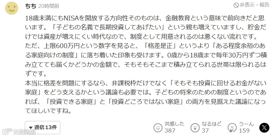 需指出的是,600万日元上限虽具公平导向,但实现年均30万日元投入仍需较强经济基础。政策真正有效,还需配套支持“无投资余力家庭”,实现对全量育儿家庭的普惠覆盖。