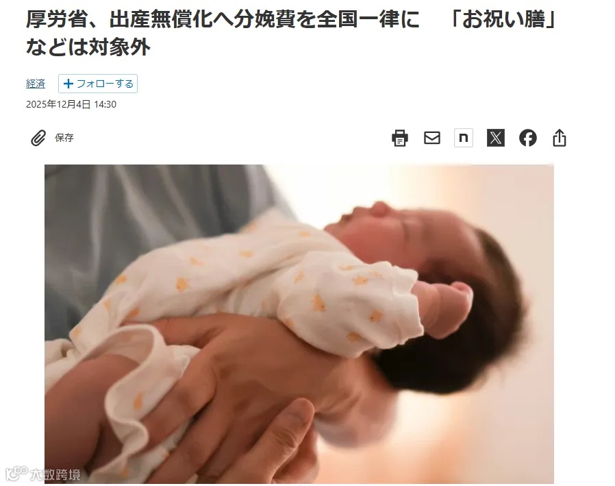 日本厚生劳动省于12月4日公布制度改革方案,拟将全国分娩费用统一定价,并通过公费全额覆盖,使产妇基本实现“零自费”。