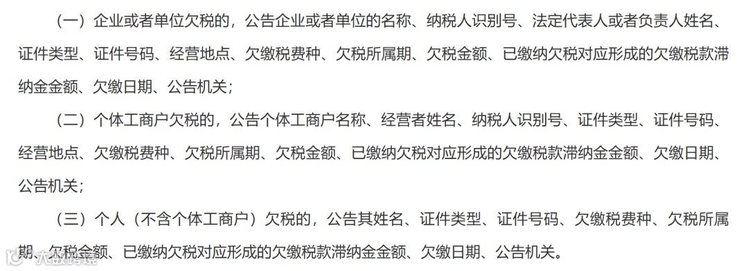 该办法的核心力度体现在公示信息的细化:企业及个体工商户将被公示名称、纳税识别号、法定代表人/经营者姓名、证件信息、经营地点、欠缴税费种、所属期、金额及滞纳金等;非个体工商户的个人欠税,其姓名、证件号等信息也将直接公示。