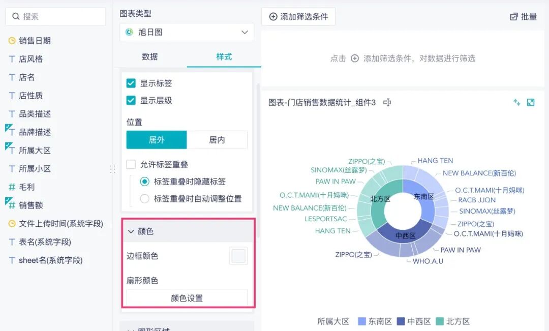对于旭日图和漏斗图,可在样式下进行颜色设置。