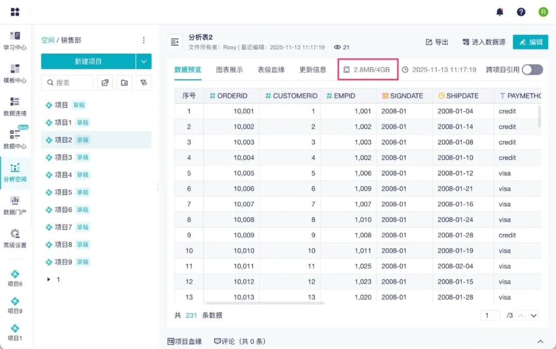 显示分析表「计算内存」的用量,用户可直观看到内存消耗情况,若超过限制则用户可以通过简化分析步骤或者升级内存方式调整,更好的利用资源。优化方案可参考:性能优化指导手册
