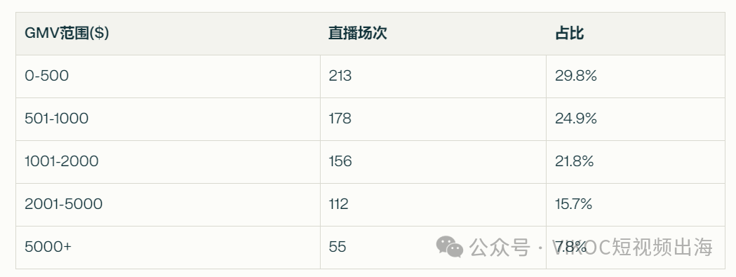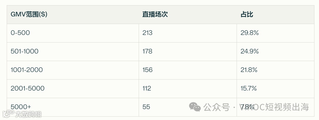 约54.7%的直播GMV在1000美元以下,但也有23.5%的直播GMV超过2000美元,显示出较大的收益差异。