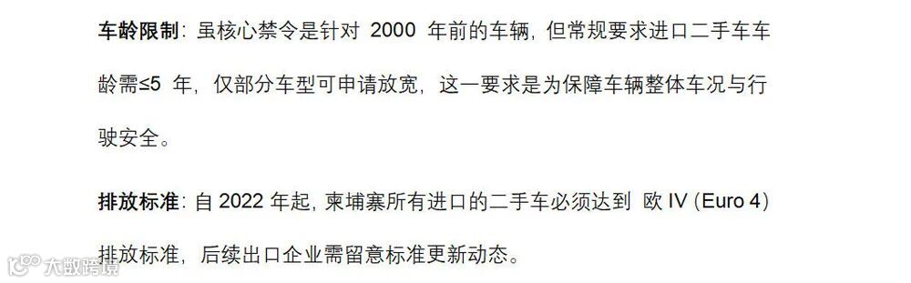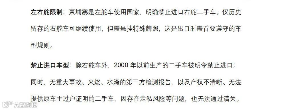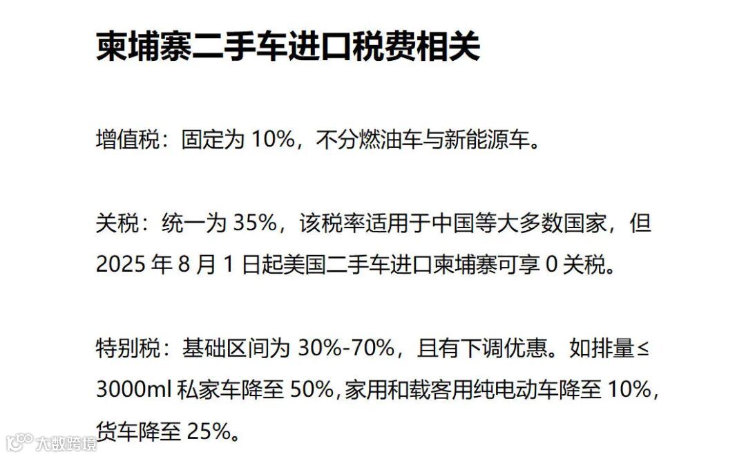 关税:常规税率为35%,但针对美国的二手车贸易实施0关税政策,这一差异化政策源于柬埔寨与美国的贸易协定。