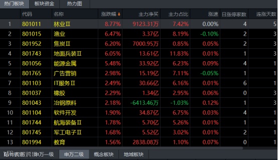机构:机构资金依然是净流出的状态,部分回流的方向主要有软件开发,能源金属,互联网服务,文化传媒等板块,行业板块跌多涨少,其中,在申万二级行业板块分类中,林业板块领涨,涨幅是8.77%。