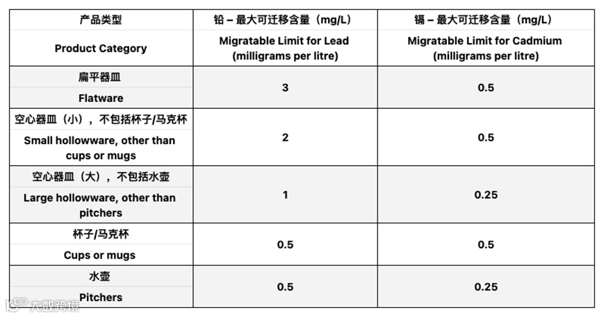 釉面陶瓷或玻璃器皿中可能释放的铅或镉的含量受到产品尺寸和形状的影响。因此,对于不同尺寸和形状的产品,GCGR下可迁移铅和镉的最大限量是不同的。下表总结了釉面陶瓷和玻璃器皿中可迁移铅和镉的限量。