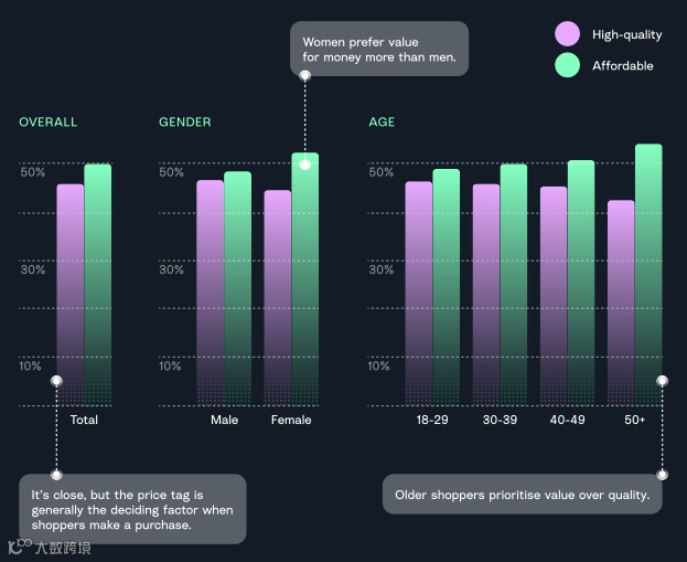 还值得注意的是,女性消费者比男性消费者优先考虑价格而不是质量,消费者年龄越大,对价格的敏感度越高。