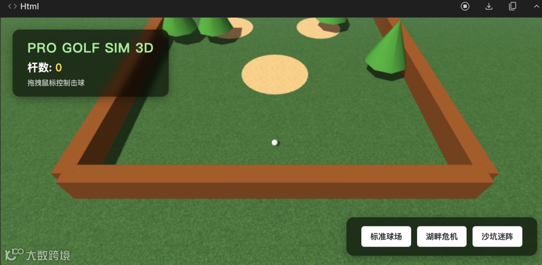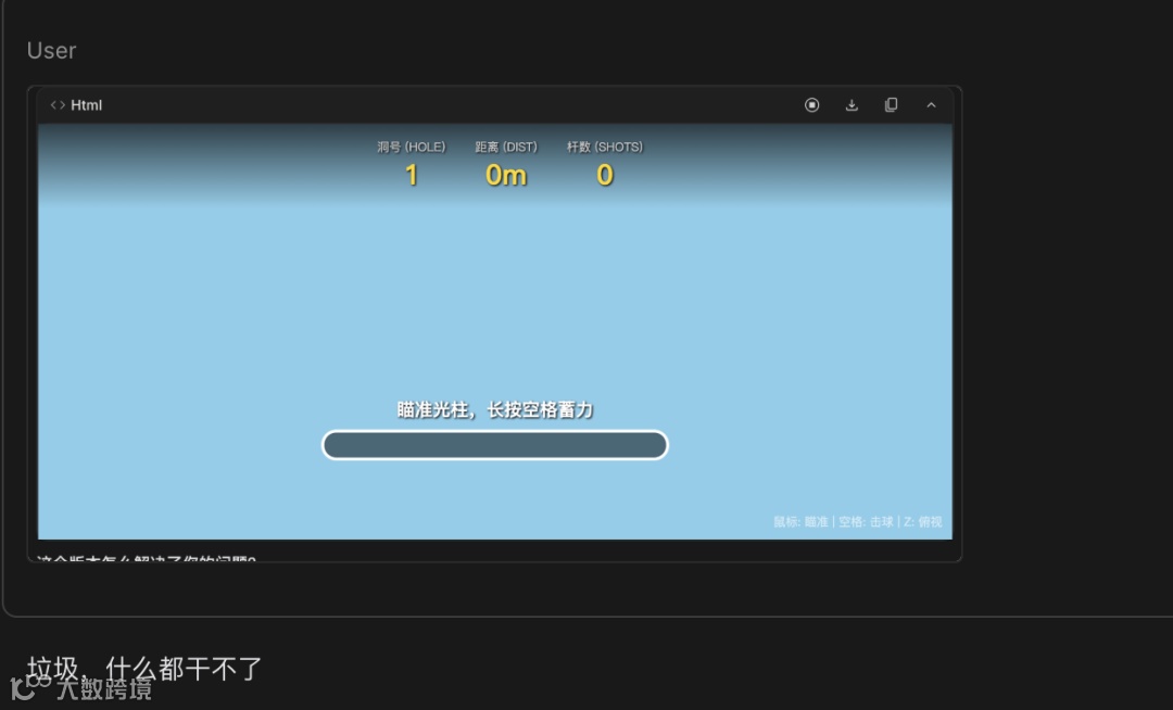 它能做成高尔夫游戏吗?能做样子, 30秒生成一个能看、能动、能击球的 Demo。但是做不好体验, 跟我想象的击球进洞,然后去下一个洞的基本功能都差一些,没有一个AI能根据提示词就做成。这需要真人开发者介入,进行深度调优。