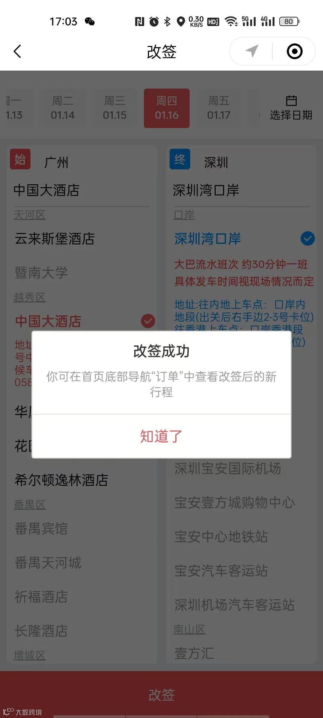 5. 不设跨线路改签,只接受日期、班次时间、上落站点的变更,线路的定义按中汽实际运营线路为准,并不以行政区进行划分;