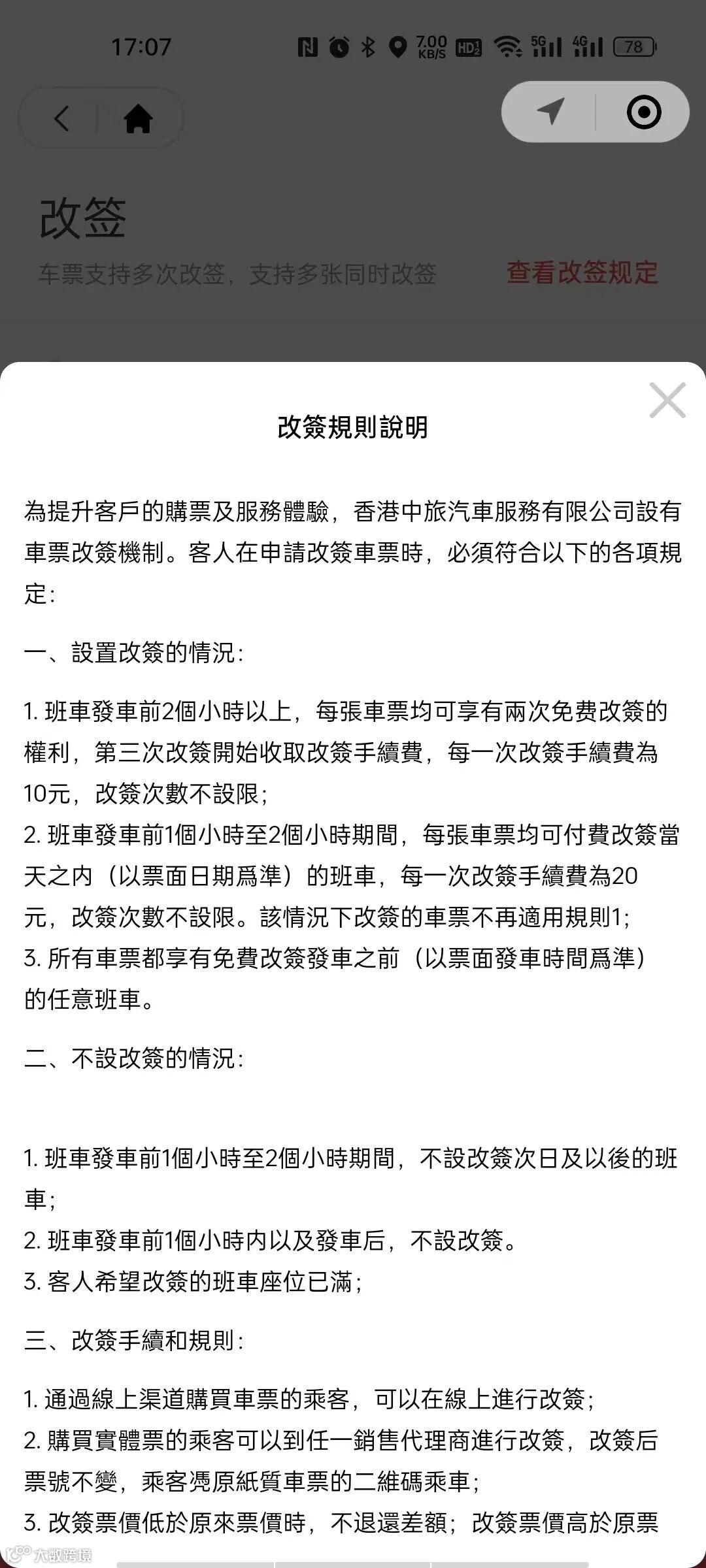 为提升客户的购票及服务体验,香港中旅汽车服务有公司设有车票改签机制。客人在申请改签车票时,必须符合以下的各项规定: