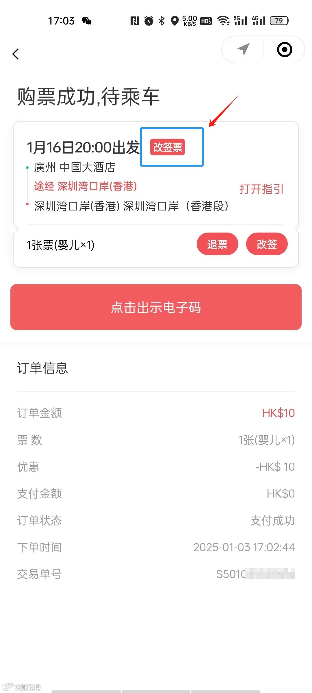 购票后,在“行程详情”页,有“退/改签”按钮,点击可发起退票或改签。