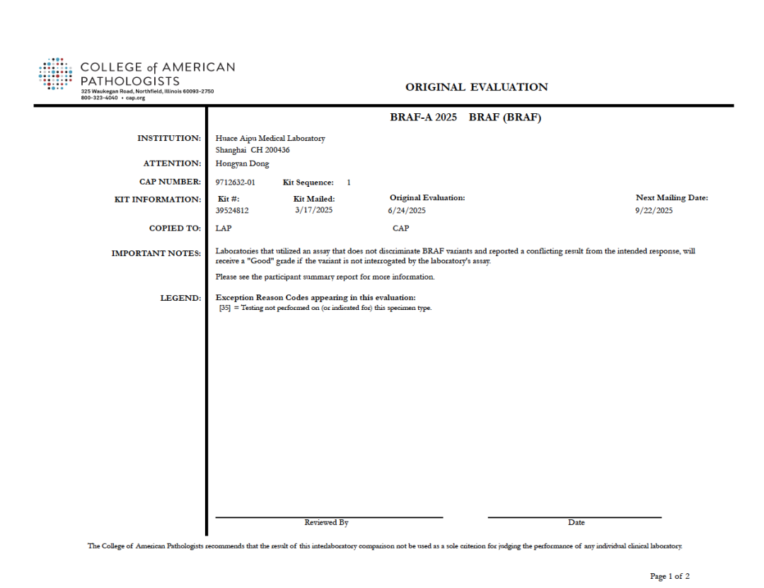CAP认证是全球公认的医学实验室质量认证体系,其PT(能力验证)项目以严苛的标准和全面的评估著称,是衡量实验室检测水平的重要依据。华测艾普连续多年以高标准通过CAP-PT认证,标志着实验室在检测准确性、流程规范性和结果可靠性方面已达到国际领先水平。