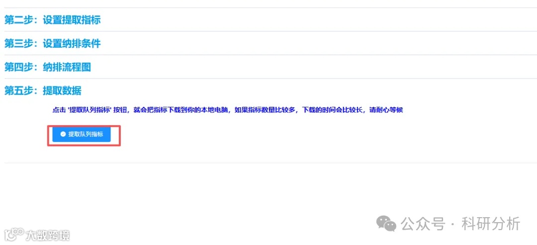 第五步就是提取指标到本地,直接点击"提取队列指标"按钮,就可以把你选择的指标根据你的纳排条件把符合条件的病人的指标下载到你的本地电脑