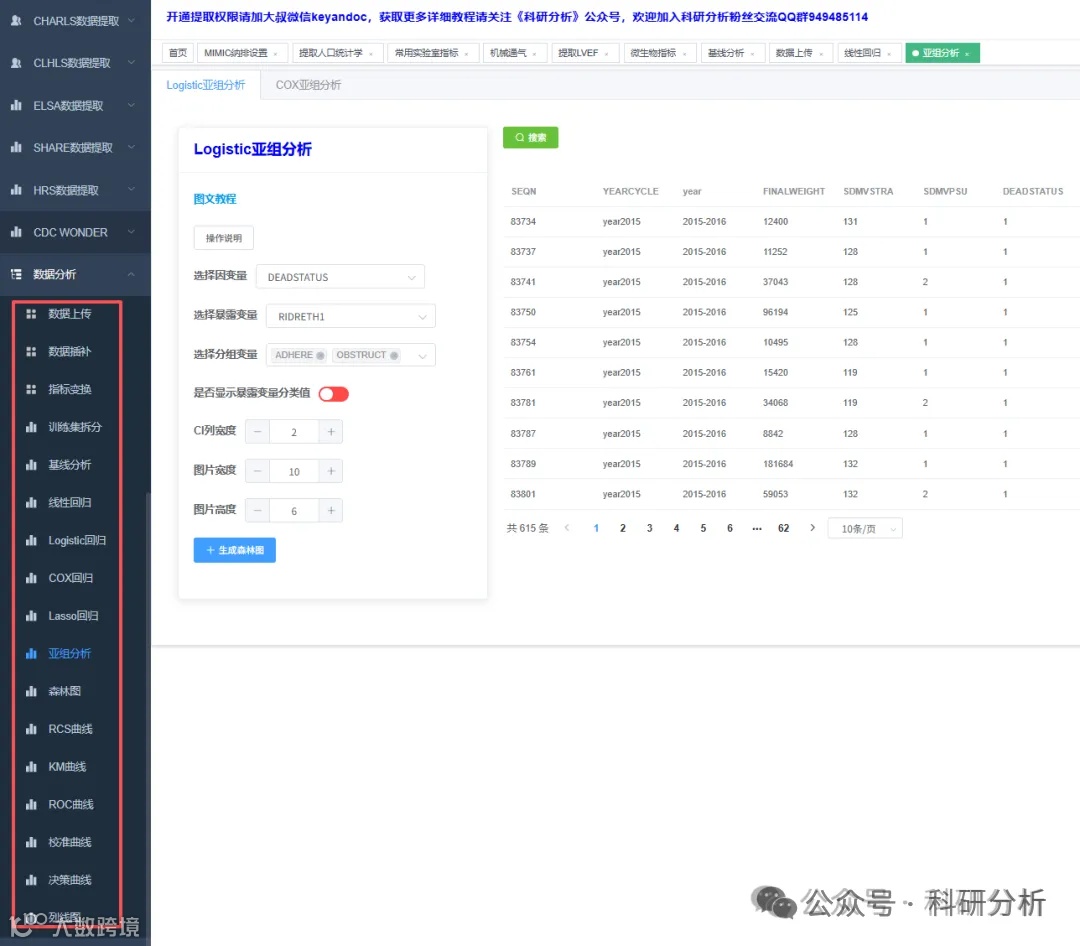 科研分析网站专注于提供医疗公共数据库(MIMIC,INSPIRE,EICU,NWICU,Nhanes,Charls,CLHLS,ELSA,SHARE,HRS,PIC)等研究,让你无需安装数据库,无需写代码就可以完成医疗公共数据库数据提取,清洗,分析并做图等工作,关注科研分析公众号,助你早日完成科研论文发表。