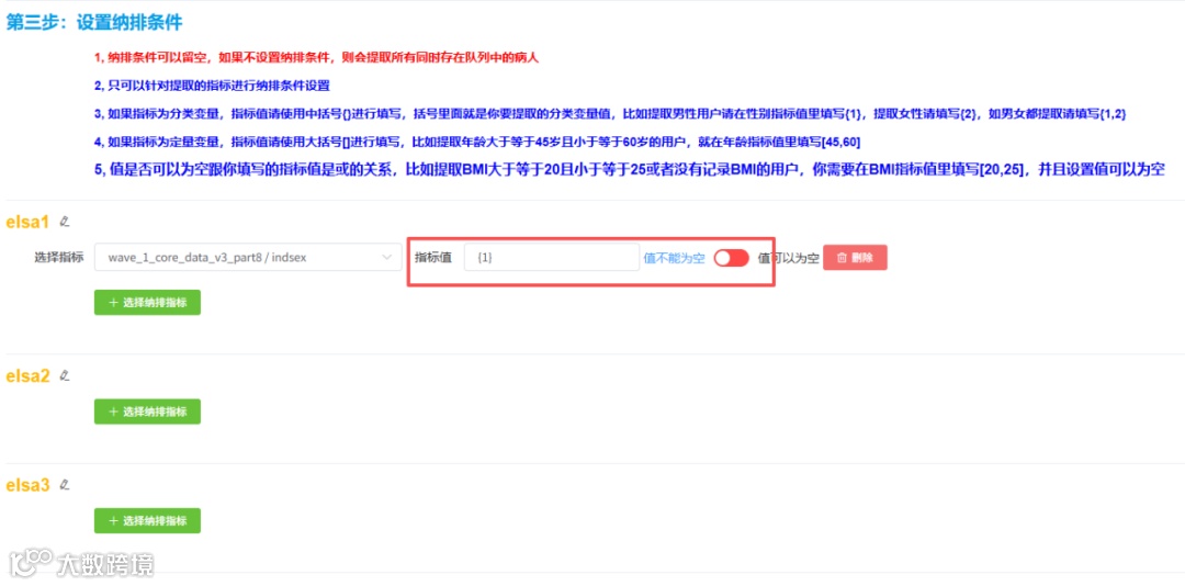 5, 值是否可以为空跟你填写的指标值是或的关系,比如提取BMI大于等于20且小于等于25或者没有记录BMI的用户,你需要在BMI指标值里填写[20,25],并且设置值可以为空(开关为绿色表示可以为空,红色表示不能为空)