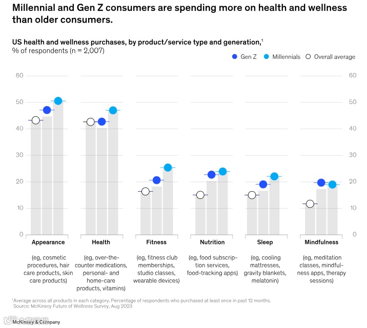 Z 世代和千禧一代消费者尤其如此,他们现在比老一辈购买更多的健康产品和服务,涉及我们在之前的研究中概述的相同维度:健康、睡眠、营养、健身、外表和正念。