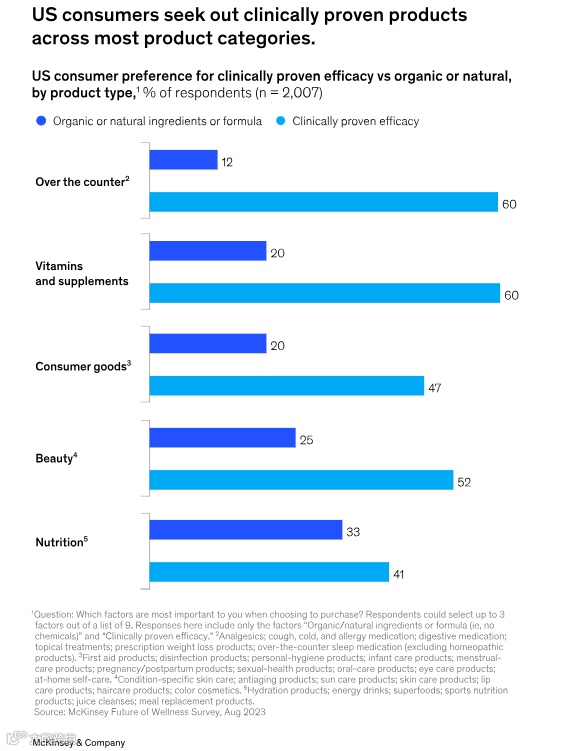 去年,我们看到消费者开始从含有清洁或天然成分的健康产品转向含有经过临床验证的成分的健康产品。如今,这种转变更加明显。大约一半的英国和美国消费者将临床有效性视为首要购买因素,而只有约 20% 的消费者将天然或清洁成分的临床有效性视为首要购买因素。这种趋势在非处方药、维生素和补充剂等类别中最为明显。