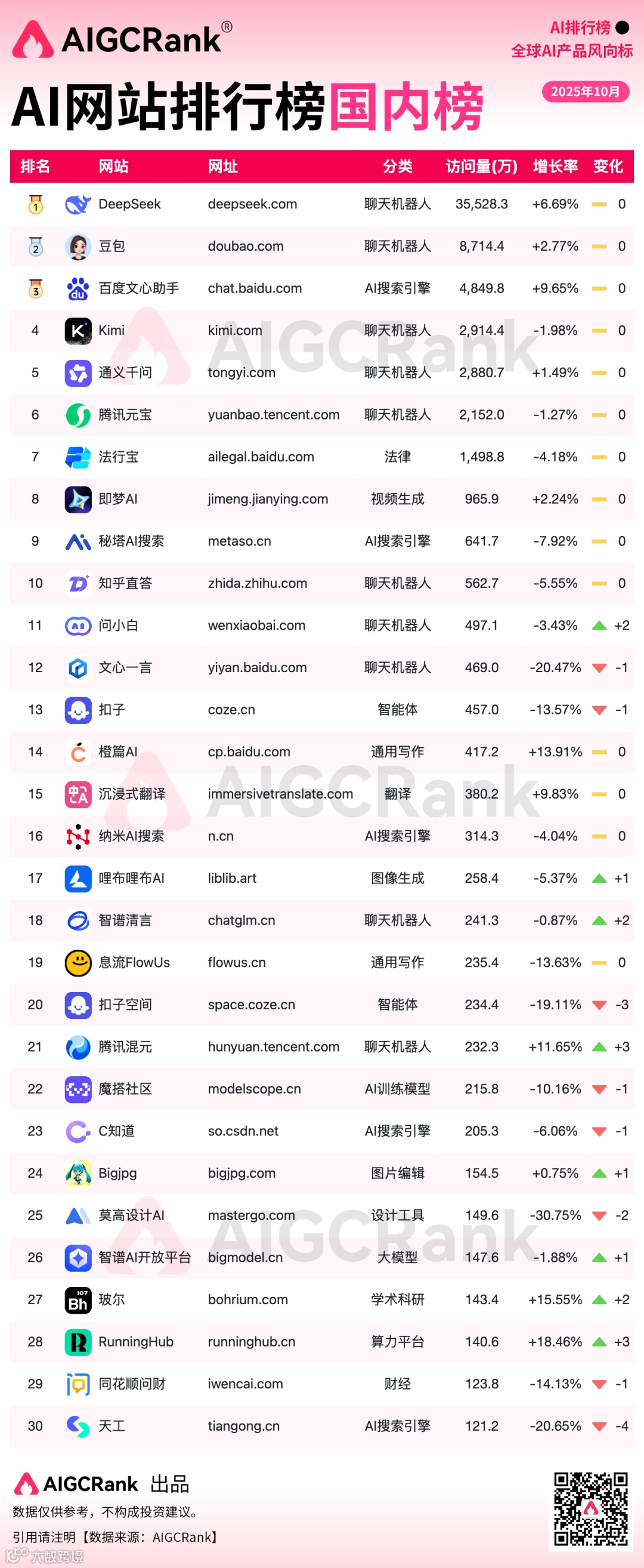 全球AI产品风向标AI排行榜 AIGCRank 今日发布2025年10月《AI网站排行榜》。AI排行榜由AIGCRank出品制作,平台基于全球3万+AI产品数据库,追踪全球AI产品动态,发布月度产品数据榜单。