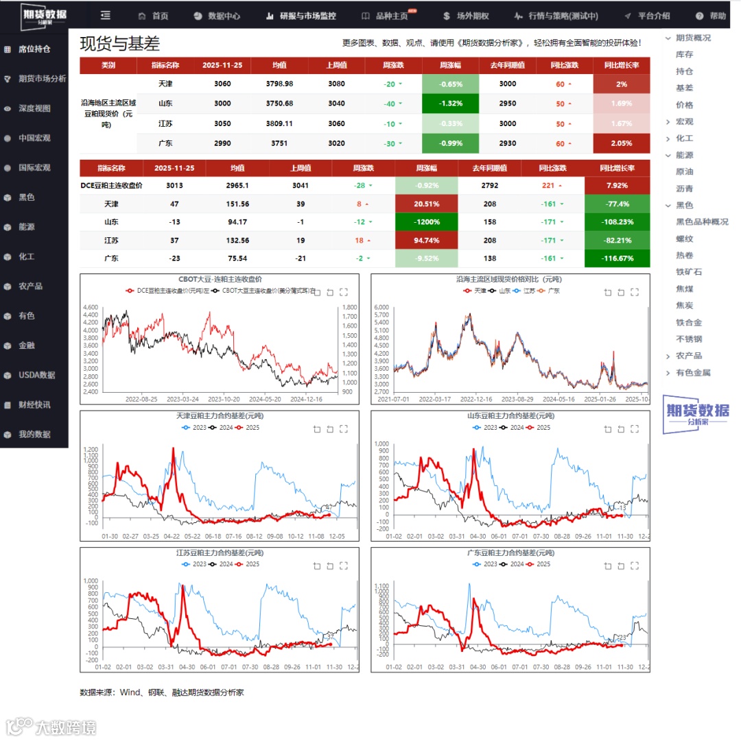 现货价格方面,天津豆粕现货价为3060.0元/吨,月涨幅60.0元/吨;日照为3000.0元/吨,月跌幅20.0元/吨;张家港和东莞分别为3000.0元/吨和2990.0元/吨,月涨幅40.0元和50.0元/吨。价格区域分化明显,反映局部供需差异。豆粕成交价约为3063.0元/吨,环比微增0.1%,处于历史同期中位偏低位。期货方面,豆粕主力01合约价格为3013.0元/吨,周下跌28.0元/吨,外盘期货价格同步走弱。基差方面,华东、华北和华南地区主力基差分别为-33.0元/吨、-23.0元/吨和-43.0元/吨,周内小幅走弱,目前处于历史同期中位偏低位。基差贴水状态表明现货市场承压,期货价格相对弱势。