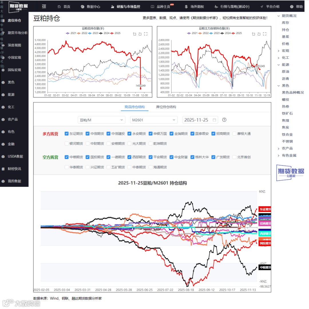 多空交易逻辑方面,空头论点集中于供应过剩:大豆压榨量高位、豆粕库存累积、外盘美豆走弱以及南美供应预期增加。总持仓量约为1453249.0手,处于历史同期最低位,周大幅下降,反映市场情绪偏空。多头则依赖成本支撑和远月需求:豆粕估值低位、远月基差成交放量以及餐饮消费回暖可能带动需求复苏。此外,油厂压榨亏损可能抑制供应扩张,为价格提供底部支撑。