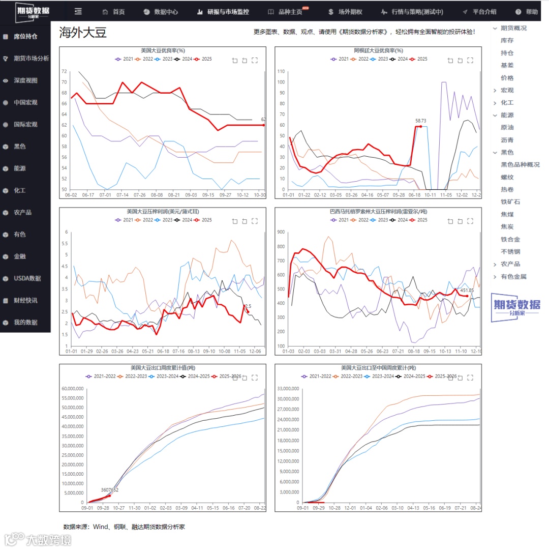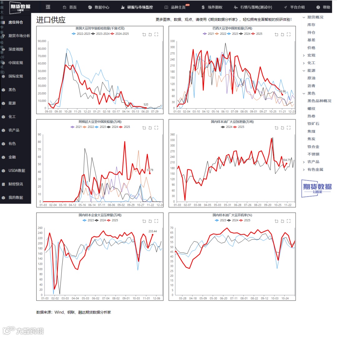 国内油厂大豆压榨量约为233.44万吨,环比大幅增加12.36%,处于历史同期最高位。开机率约为64.22%,同样创历史新高,环比上升12.37%,同比增幅14.68%。高开机率与压榨量表明供应端保持强劲,主要得益于大豆到港量高位和油厂维持高开工。然而,压榨利润处于近七年同期次低水平,油厂压榨延续亏损,这可能抑制未来供应扩张。南美大豆生产形势总体稳定,但阿根廷播种进度滞后于去年同期,巴西大豆种植进度略慢,这为未来供应带来不确定性。总体来看,供应端宽松局面短期难改,但随着美豆阶段性走弱和南美新豆上市,供应压力或进一步加剧。