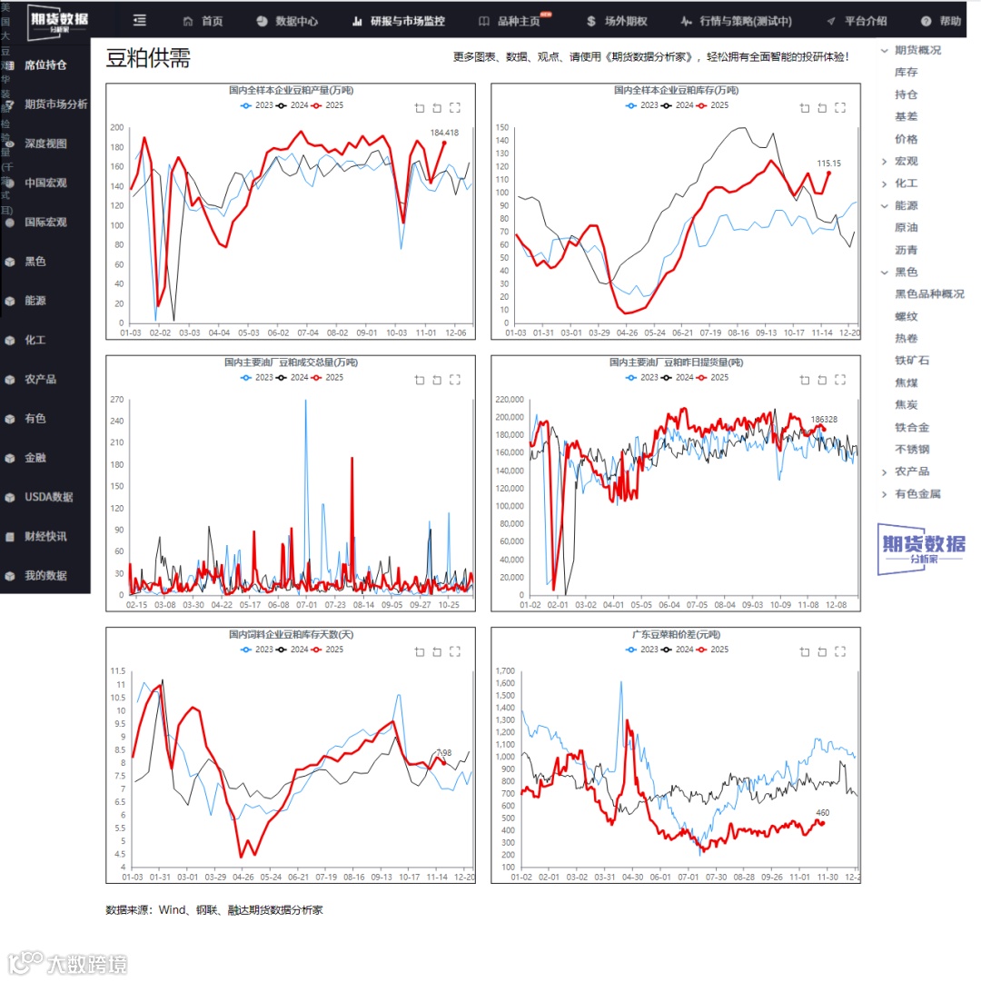近期,豆粕市场在供需基本面的多重因素交织下,呈现复杂的波动格局。供应端保持高位运行,而需求端表现相对平稳,市场情绪在乐观与谨慎之间摇摆。作为期货研究员,本文将结合最新数据与市场动态,从库存、供应、需求、价格及基差变动、估值对比、未来预期和多空逻辑等层面,深入剖析豆粕市场的核心驱动力,为投资者提供决策参考。